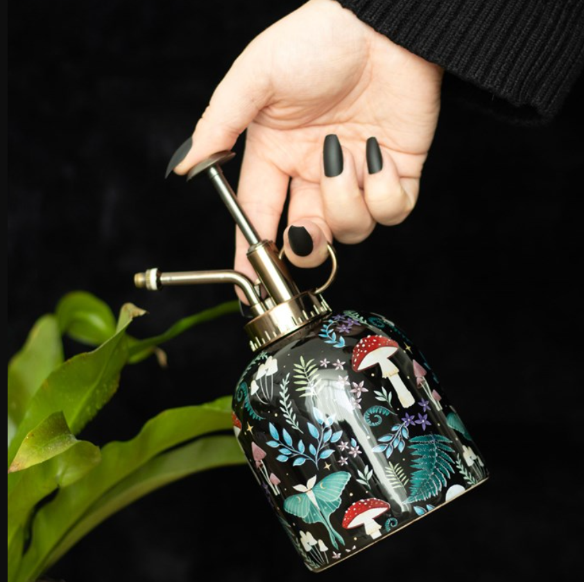 This stunning glass plant mister features a beautiful dark forest design complete with illustrations of flora and fauna across a black background sprinked with pretty moon and star details.